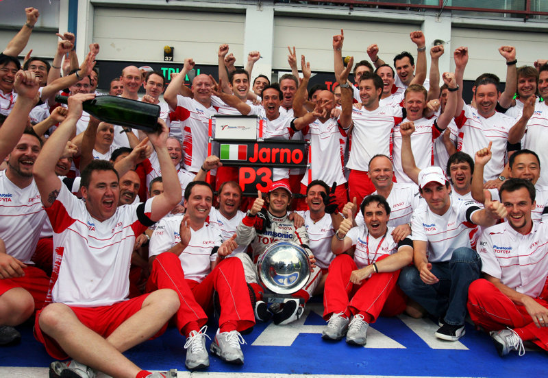 Jarno Trulli hadde helt fra starten hatt ett godt løp og lå på en solid tredjeplass når det begynte såvidt å regne litt på banen. Bak seg hadde Jarno Trulli Heikki Kovalainen og Robert Kubica. Robert Kubica hadde hatt en vanskelig helg og ikke klart å få ett oppsett på hans BMW som fungerte optimalt. Men når det begynte å småregne litt på Magny-Cours-banen virket det som om Jarno Trulli hadde større problemer enn de to bak seg. Heikki Kovalainen og Robert Kubica var derfor raskt oppi girkassa til Jarno Trulli. Jarno Trulli fikk forøvrig raskt beskjed over teamradioen å holde Heikki Kovalainen bak seg. Men jeg regner ikke med at erfarne Jarno Trulli hadde behov for å få en slik beskjed om radioen.