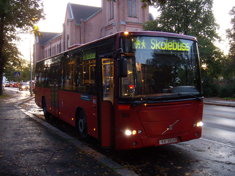 «Smilte jeg pent?» spurte sjåføren når jeg kom bort til bussen. «Det så jeg ikke», svarer jeg. «Jeg smilte så bredt jeg bare kunne»! sier kollegaen min. «Jeg ser det nok når jeg kommer hjem» svarer jeg. «Eller er jeg så sleip at jeg sklir av filmen?» humrer kollegaen min. Nå bruker jeg riktignok ikke film, men morsomt allikevel! Jeg setter meg på plass i bussen, prøver ihvertfall så godt jeg kan å få en behagelig sittestilling. Men det må være noe galt med dette setet, jeg føler at jeg sitter og heller til høyre. Mulig sitteputa er skeiv eller at det er noe galt med ryggen. NOE galt er det ihvertfall. Men siden jeg bare kjører denne bussen en tur når jeg først har den, går det som regel bra. Hadde jeg sittet i et slikt sete en hel dag, hadde jeg nok måttet hilse på kiropraktoren etterhvert. Jeg pleier som regel å si at disse gassbussene har ganske mye personlighet. De har litt «nykker» og er litt vanskeligere å kjøre pent og behagelig enn våre vanlige dieselbusser. Men hvis man bare får nok tid bak rattet på dem, går det vel ann å kjøre disse behagelig også. Jeg har ihvertfall hatt ganske gode erfaringer med buss #143, som er den første gassbussen vi fikk. Før dette skoleåret var det nemlig buss #143 vi hadde fast på første del av det skiftet jeg har kjørt i dag. Men nå har vi som sagt fått buss #160 som er av typen Volvo 8700 LE (Low entry).