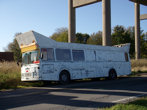Rullatoren begynte fort å trille når sjåføren begynte å kjøre, så jeg gikk frem og satte på bremsen på rullatoren. Jeg har da tross alt hatt på såpass mange rullatorer på bussen at jeg vet hvor bremsen er! Så slapp vi å ha en rullator på ville veier i bussen i dag. Det var allerede en sykkel i bussen også, så det var litt trangt midt i bussen. Vel over Fredrikstad-brua var det på tide å gå av bussen og rusle ned til garasjen. På veien fant jeg selvfølgelig noen ting å ta bilder av, deriblant for å illustrere at jeg var ute og gikk. I tillegg ble det noen bilder av Fredrikstad-brua og ikke minst en utrolig sliten russebuss som står parkert under brua.