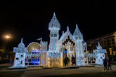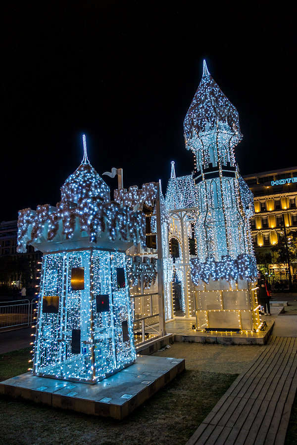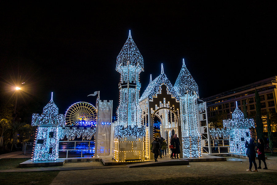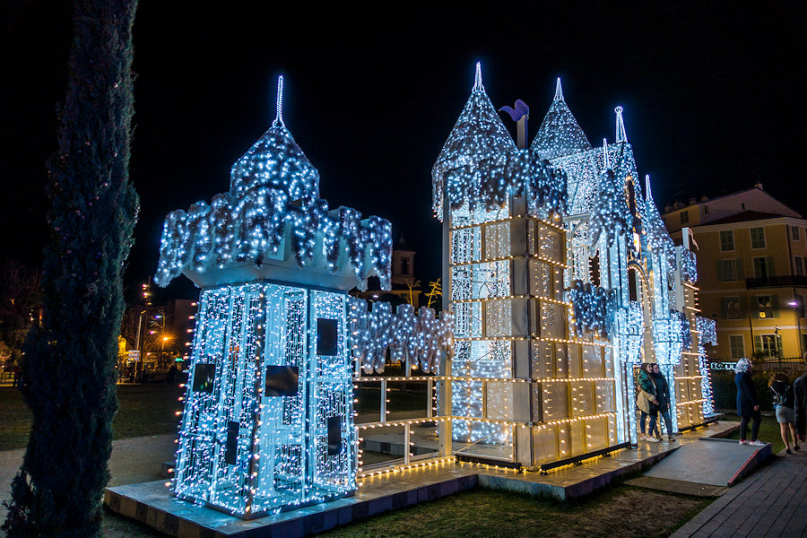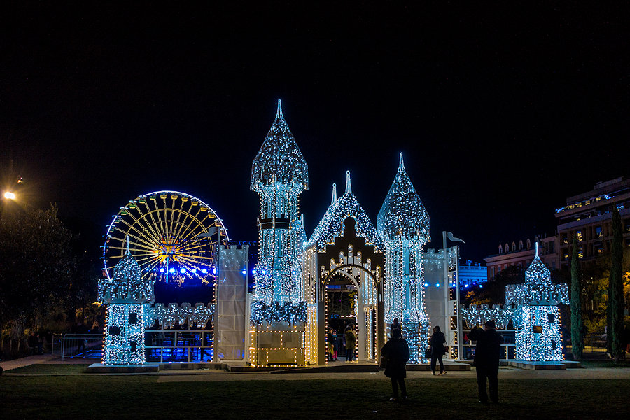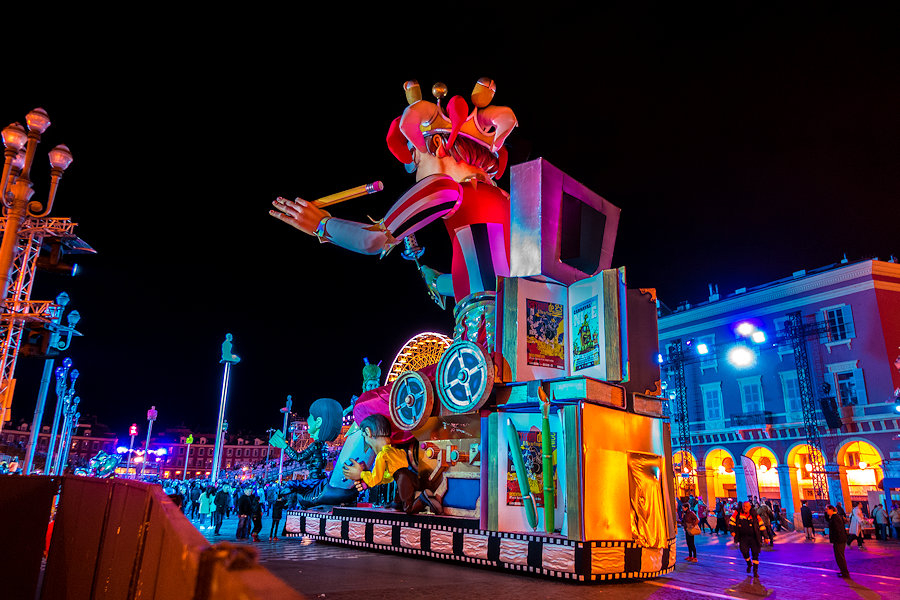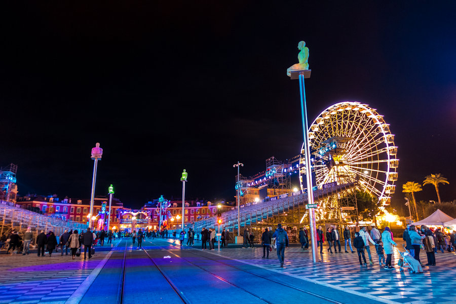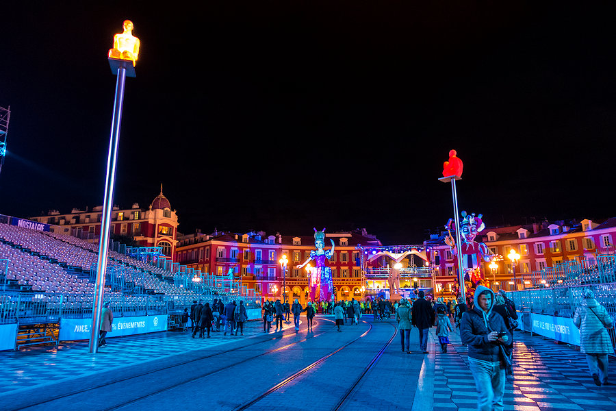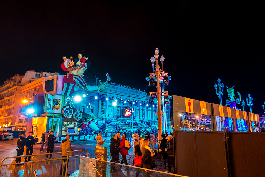 Etter Villefranche-sur-Mer og Eze gikk turen til sentrum av Nice. Denne gangen etter at det hadde blitt mørkt. Planen var å se litt på livet i byen og spise på Temple Bar. Turen gikk over Place Massena, det store torvet i sentrum av Nice. Jeg fikk tatt noen få bilder på Place Massena før sikkerhetsvaktene begynte å jage oss ut fra området. De startet med andre ord ganske tidlig med å rydde plassen før karnevalet skulle starte kl 21.00 på kvelden. Jeg ble derfor sendt i motsatt retning av hvor foreldrene mine hadde gått, når jeg prøvde å gå den andre veien, så var fikk jeg raskt beskjed om at jeg måtte fjerne meg og gå den andre veien. Så da var det bare å gjøre som man fikk beskjed om og bare ta en telefon. Men mamma hadde klart å komme etter meg, så det løste seg ganske enkelt. Jeg hadde egentlig håpet å få tatt litt flere bilder i mørket før vi ble jaget bort, men sånn er det.