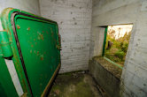 Bunkeren for den rekylfrie kanonen er låst på Alshus, men det er ikke bunkeren for maskingevær. Der står panserdøra åpen og det er bare å ta en tur inn hvis man ønsker det. Og disse dørene er like små som vanlig, så det er et prosjekt i seg selv å komme inn. Siden døra er litt opp på betongveggen til bunkeren, så var det mulig å komme seg inn med å sette det ene beinet inn først og dermed sette seg i døråpningen og bøye hodet innenfor. I motsetning til tilsvarende bunker ved Stensvik, var ikke denne full av skrot. Det eneste jeg fant inne i bunkeren var en plaststol i kamprommet for maskingevær. Utrolig gøy må jeg si at det var å se at festeanordningen eller hva nå det heter for noe for maskingeværet fortsatt var på plass i denne bunkeren! Den var festet til skinna i veggen under åpningen ut mot Vesterelva som disse stillingene skulle beskytte. Dette måtte jeg jo selvfølgelig ta en del bilder av! Denne festeanordningen var ikke på plass i bunkeren ved Stensvik, som jeg også skrev i den artikkelen. Når jeg skrev dette hadde jeg allerede vært på Alshus og tatt en nærmere titt på bunkeren der. Derfor visste jeg hva som manglet i bunkeren ved Stensvik.